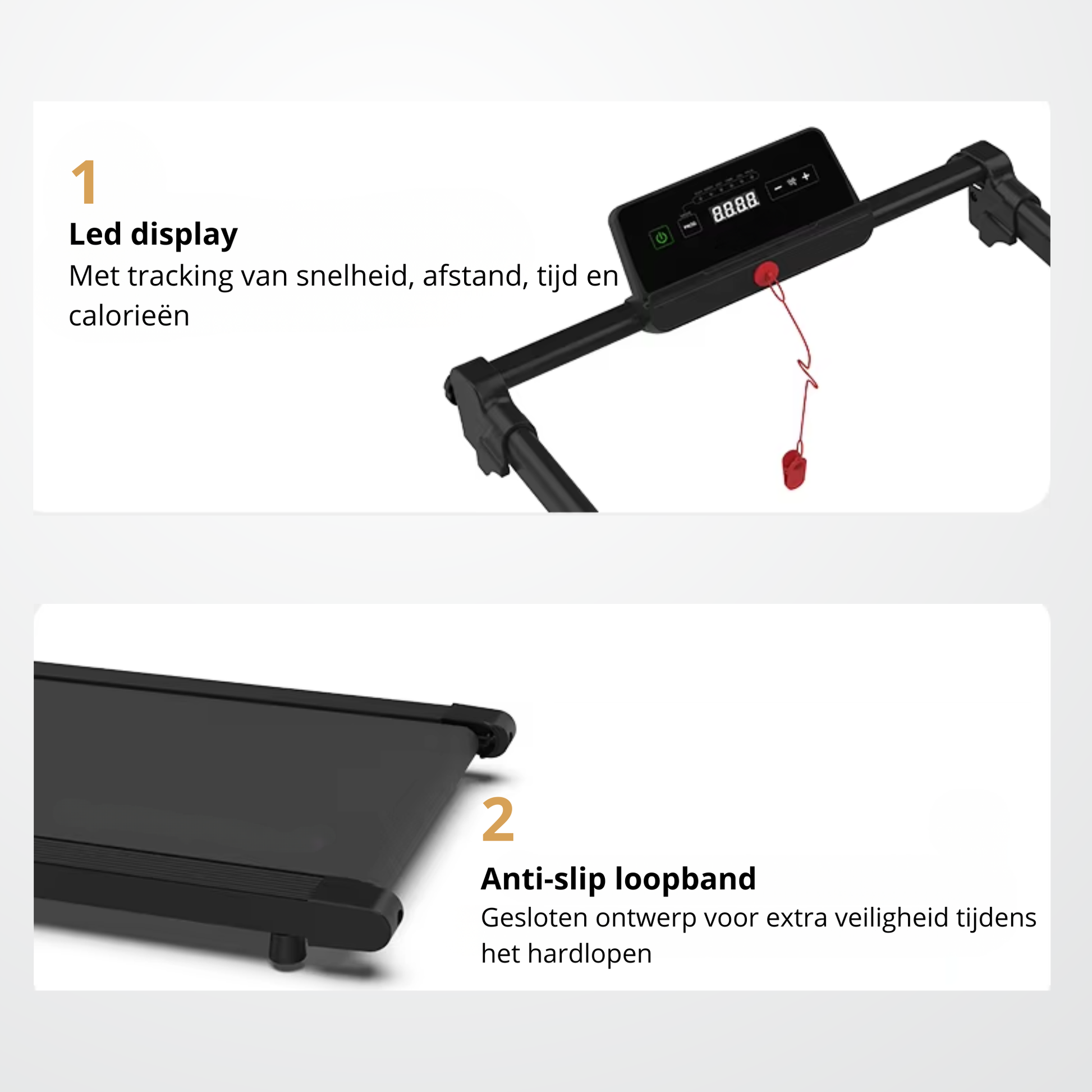 Met 12 voorgeprogrammeerde workouts wordt trainen nooit saai. De automatische snelheidsaanpassing zorgt voor natuurlijke variatie, terwijl het display realtime je prestaties toont. De antislip-laag geeft een veilig gevoel bij elke stap.
