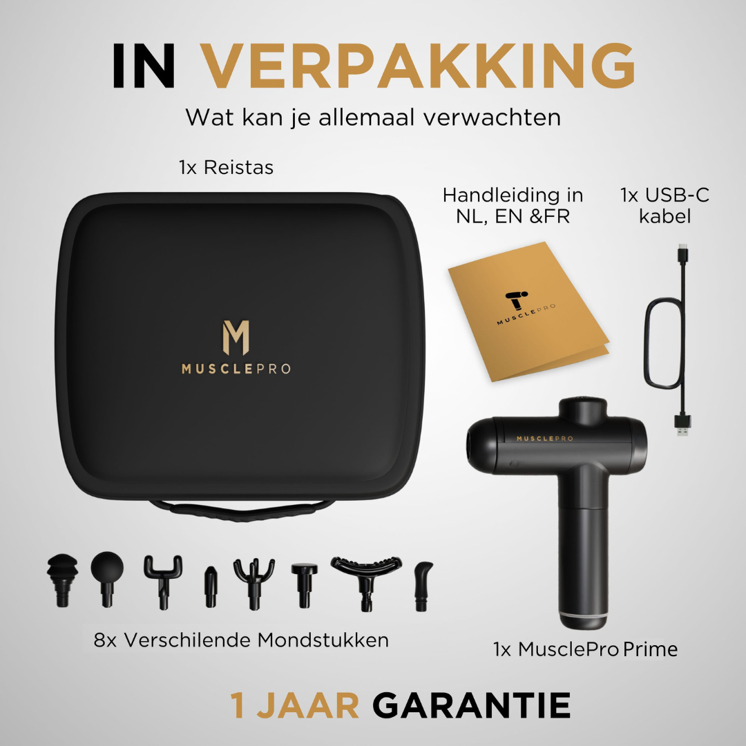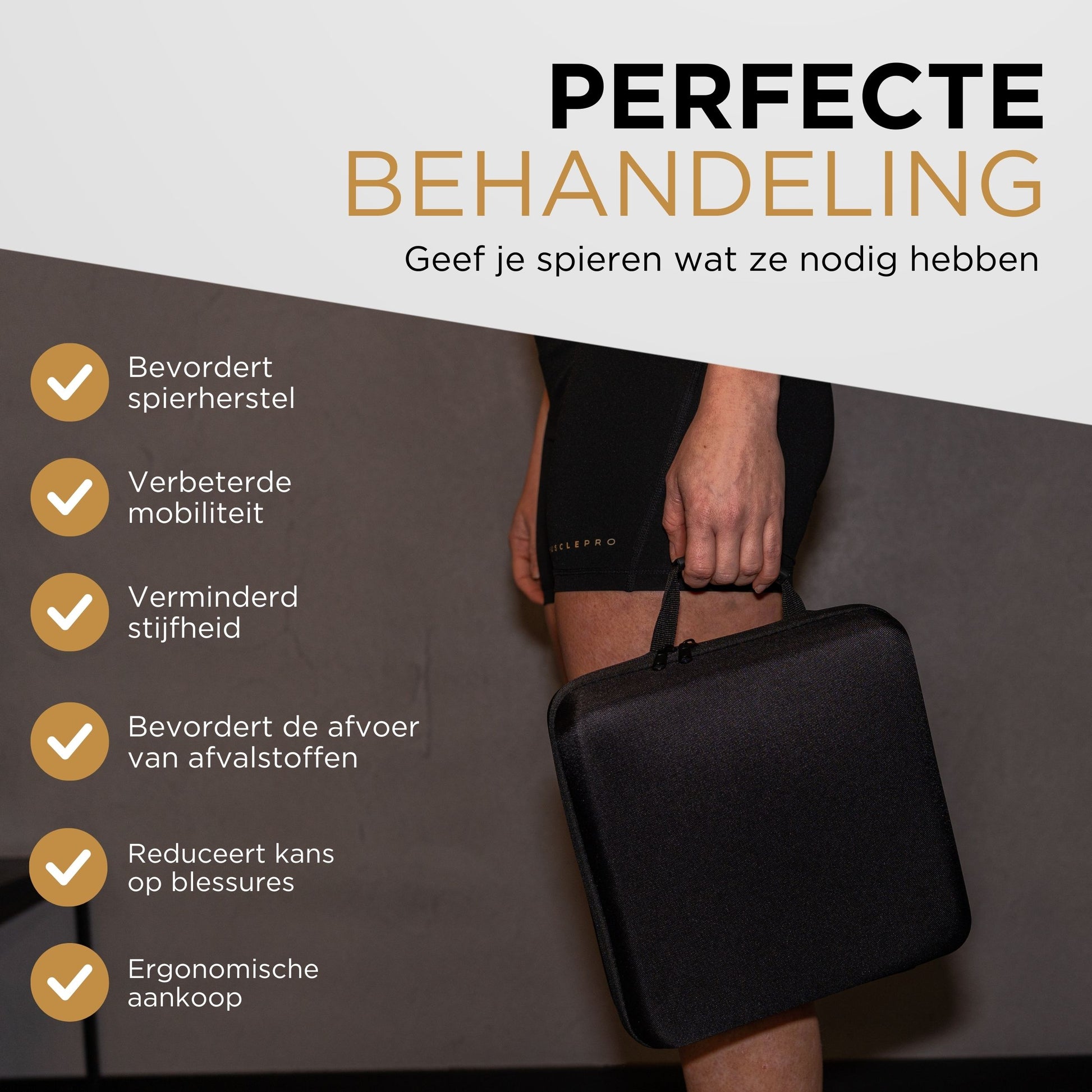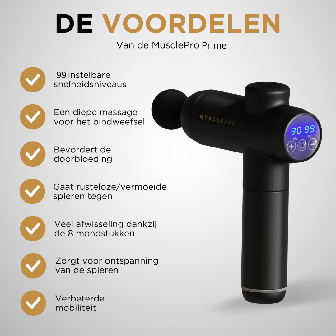 De 8 verschillende mondstukken en de 99 instelbare snelheidsniveaus geeft je stijve of overspannen spieren een diepe massage die de stijfheid van je spieren verminderd en het bindweefsel verzacht. Het gebruik van de MusclePro Prime massage gun bevordert de doorbloeding van de spieren wat zorgt voor een beter herstel van de spieren en een verbeterde mobiliteit.